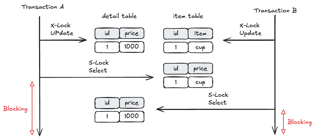 Transaction A가 detail 데이터에 X-Lock을 Transaction B가 item 데이터에 X-Lock을 설정한 후 Transaction 에서 X-Lock이 설정되어있는 item 데이터에 S-Lock을 설정합니다.
